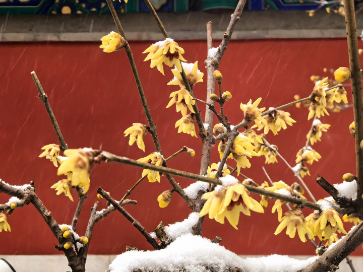 当下正值花期的品种是十月梅,在卧佛寺红墙黛瓦的映衬下,蜡梅更显古朴典雅的韵味,为灰暗的天气增加了一抹亮色。鹅黄色的花朵玲珑剔透,仿若宣纸上的水墨画,蜡梅在雪中散发出淡淡幽香,吸引游客扛着“长枪短炮”记录下美景。